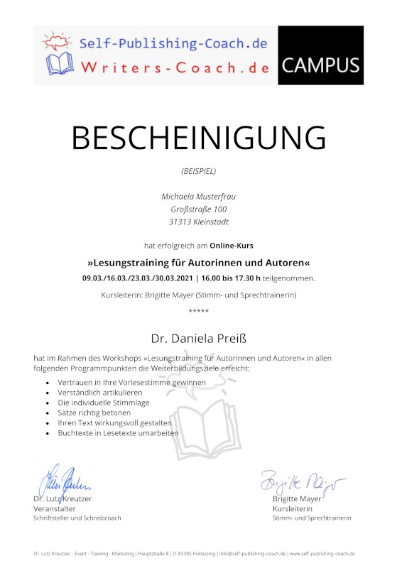 „Ein ausgezeichneter Gruppen- und auch Einzelunterricht mit Videoaufzeichnung, inbegriffen der Vorfreude auf die kommende Lesung des eigenen Buchs – ab jetzt natürlich vor Publikum und mit dem Publikum, selbstbewusst und angstfrei!“